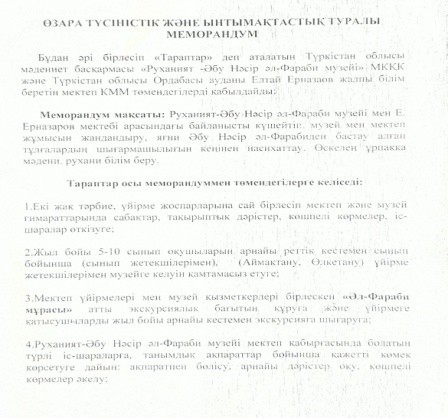 1.11 «Руханият-Әбу Насыр әл-Фараби музейі» МККҚ және Түркістан облысы Ордабасы ауданы, Елтай Ерназаров жалпы білім беретін мектеп КММ ынтымақтастық меморандумға отырды.