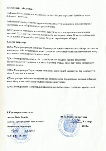 «18 колледж» мемлекеттік коммуналдық  қазыналық кәсіпорны директоры Ақтөре Жандос Жарылқасынұлы және Ордабасы ауданы білім беретін  мектеп коммуналдық мекемесінің  директоры Барбол Бауыржан Оразбекұлы тараптар төмендегілер туралы келісімдер жасасты.