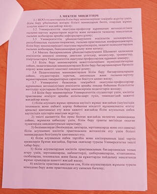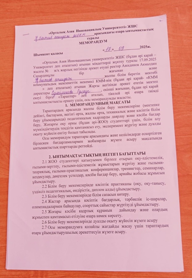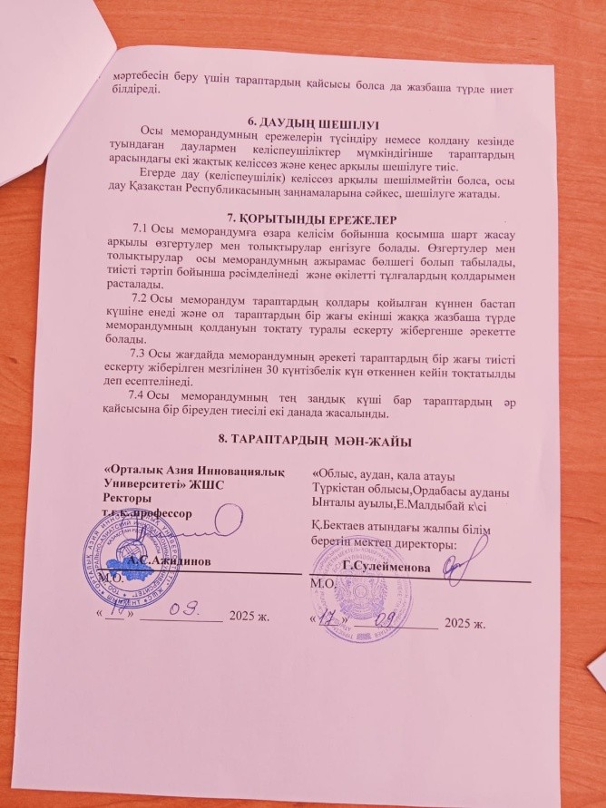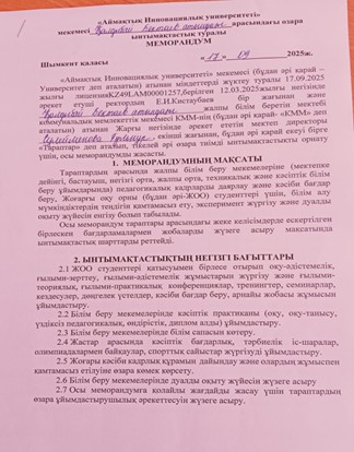 1.11 «Орталық Азия Инновациялық университеті ЖШС ректоры техника ғылымдарының кандидаты,профессор А.С.Ажидиновпен Түркістан облысы Ордабасы ауданы Қ.Бектаев атындағы жалпы білім беретін мектебі коммуналдық мекемесінің директоры Сулейменова Гулнур Батырбаевна тараптары төмендегілер туралы келісімдер жасасты