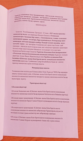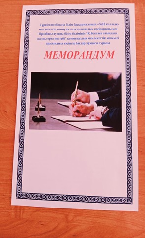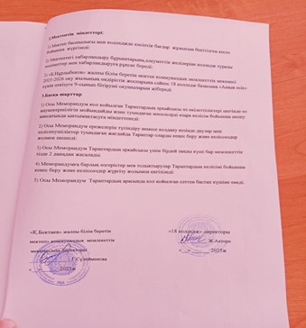 1.11 «18 колледж» мемлекеттік коммуналдық қазыналық кәсіпорының директоры Ақтөре Жандос Жарылқасынұлымен Түркістан облысы Ордабасы ауданы Қ.Бектаев атындағы жалпы білім беретін мектебі коммуналдық мекемесінің директоры Сулейменова Гулнур Батырбаевна тараптары төмендегілер туралы келісімдер жасасты
