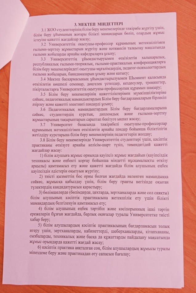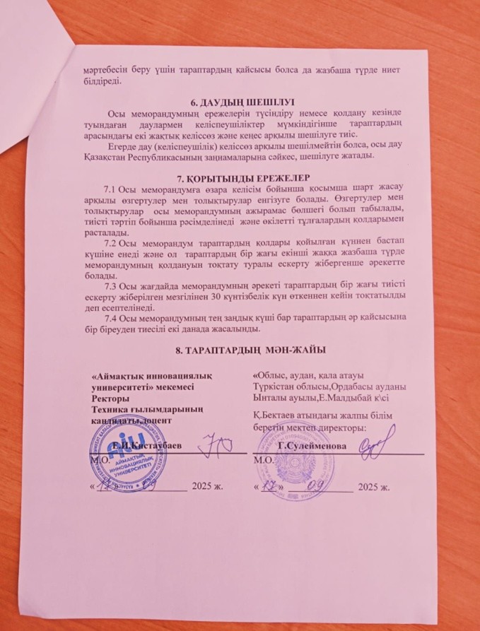 1.11 «Аймақтық Инновациялық университеті мекемесінің ректоры техника ғылымдарының кандидаты,доцент Е.И.Кистаубаевпен Түркістан облысы Ордабасы ауданы Қ.Бектаев атындағы жалпы білім беретін мектебі коммуналдық мекемесінің директоры Сулейменова Гулнур Батырбаевна тараптары төмендегілер туралы келісімдер жасасты
