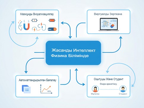 Мақалада физика пәнінің «Электр және магнетизм» бөлімін оқытуда жасанды интеллект (ЖИ) технологияларын қолданудың тиімділігі қарастырылған. Зерттеу барысында модульдік оқыту форматы қолданылып, оқу процесі үш негізгі бағытта ұйымдастырылды: оқу мазмұнын визуализациялау, виртуалды зертханалық тәжірибелер жүргізу және автоматтандырылған бағалау жүйесін пайдалану. PhET симуляторлары, Google Forms және басқа да цифрлық платформалар арқылы оқушылардың өздігінен жұмыс істеу белсенділігі мен пәнге қызығушылығы артқаны байқалды.