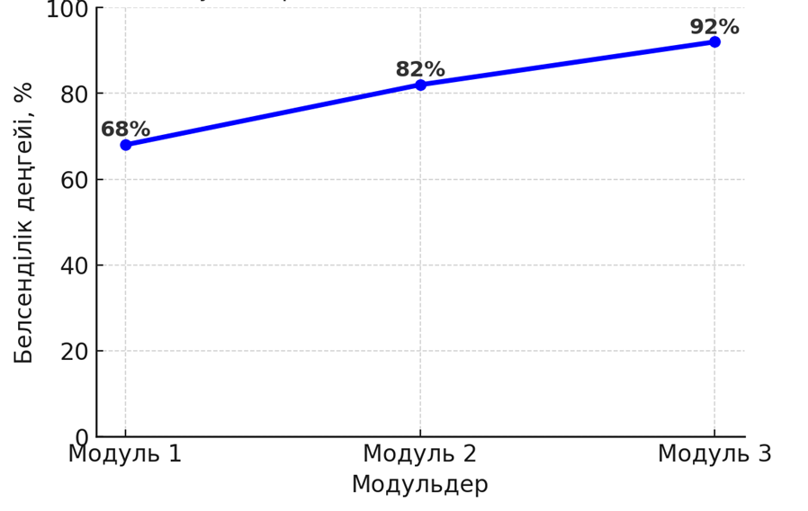 Модульдік оқыту барысында оқушылардың сабаққа қатысу белсенділігі біртіндеп артып отырды (Сурет 2). Егер алғашқы модульде белсенділік 68%-ды құраса, соңғы модульде бұл көрсеткіш 92%-ға жетті. Бұл – жасанды интеллект көмегімен ұйымдастырылған интерактивті сабақтардың оқушылардың ынтасын арттырғанының дәлелі.