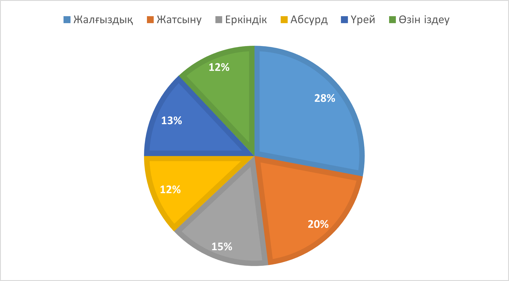 Сурет-1. Виртуалды қазақ прозасындағы экзистенциалистік категориялардың үлес салмағы