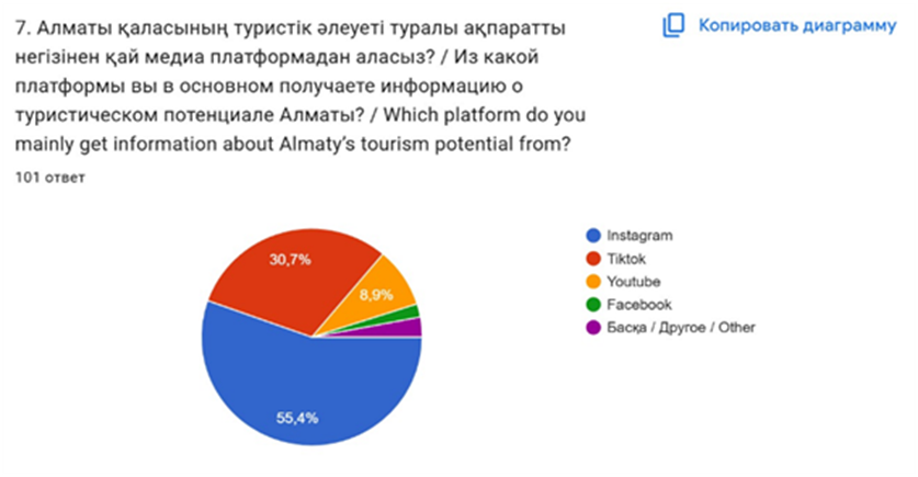 Зерттеу барысында онлайн сауалнама жүргізілді. Алматы қаласының туристік тартымдылығына және адамдардың туристік шешім қабылдауына қаншалықты әсер ететінін анықталған болатын. Сауалнамаға 101 респондент қатысты. Негізгі сұрақтар туристік шешімге ықпал ететін платформаларды, контент түрлерін және инфлюенсер рөлін анықтауға бағытталды. (Сурет 1,2,3).