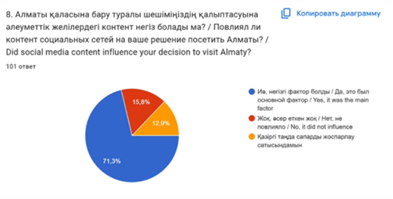 Қатысушылардың 71,3%-ы әлеуметтік желілер Алматыға бару шешіміне негізгі фактор болды деп жауап берді. 15,8%-ы әсер етпегенін, ал 12,9%-ы сапар жоспарлау кезеңінде екенін айтты.Бұл әлеуметтік желілердің туристік шешім қабылдауға айтарлықтай ықпал ететінін көрсетеді(сурет-2).