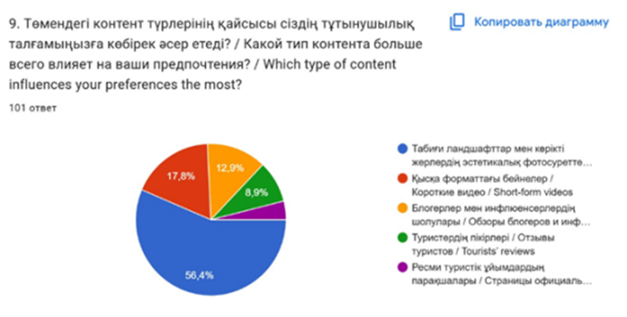 Респонденттердің 56,4%-ы табиғи ландшафттар мен көрікті жерлердің фотосуреттері ең көп әсер етеді деп жауап берді. 17,8%-ы қысқа форматтағы видеоларды, 12,9%-ы блогерлер мен инфлюенсерлердің шолуларын, 8,9%-ы туристердің пікірлерін таңдады. Ал ресми туристік ұйымдардың парақшаларының әсері салыстырмалы түрде төмен болды(сурет-3).
